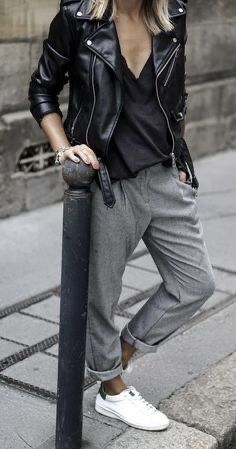 Os vários tipos de jaqueta de couro podem ser combinados com praticamente qualquer modelo de calça. As jeans são uma combinação clássica, mas você também pode usar com calça de alfaiataria, de malha, leggings e muito mais.